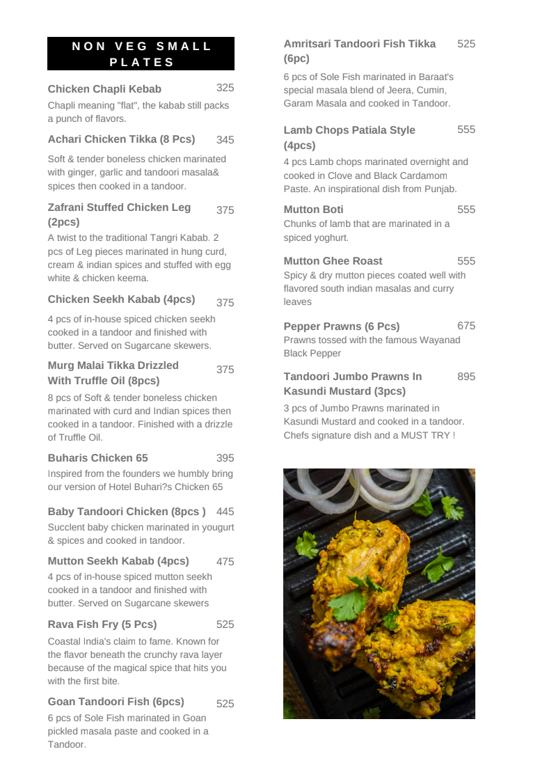Baraat takes the authentic regional recipes from Punjab, Rajasthan, Bengal, Goa and Kerala, beyond the mundane preparations and brings a menu as distinctive, yet traditional as the presentation. The expert chefs at Baraat have ensured use of only high class & authentic ingredients so that the correct culinary flavours are delivered.